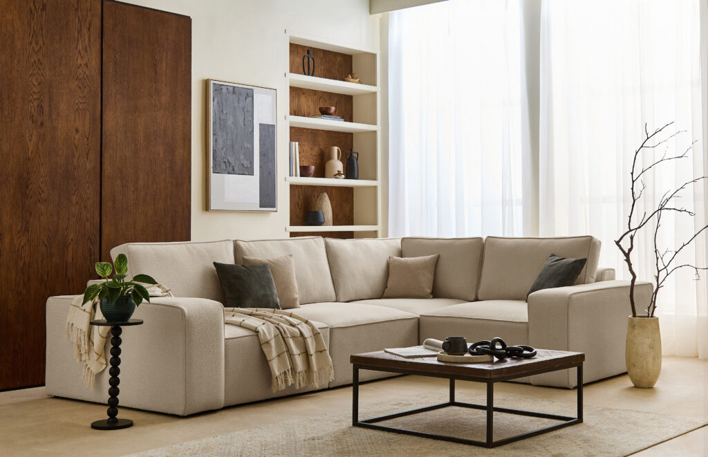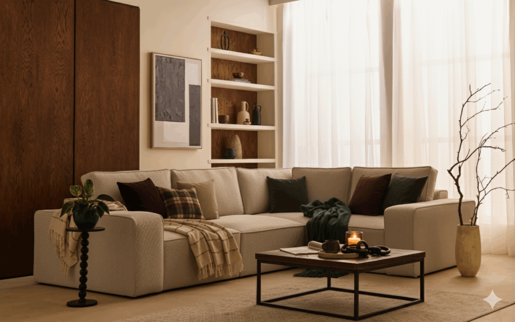 When building a winter palette, the foundation is key. Earth tones provide the essential warmth and sophistication needed for your largest piece: your sofa.