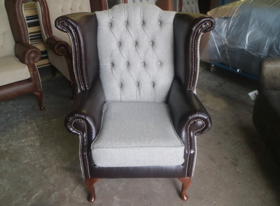 ViewLuxury Queen Anne Wing Chair - Fabric MOON DEEPDALE MUSHROOM & Leather DARK BROWN TRUFFLE